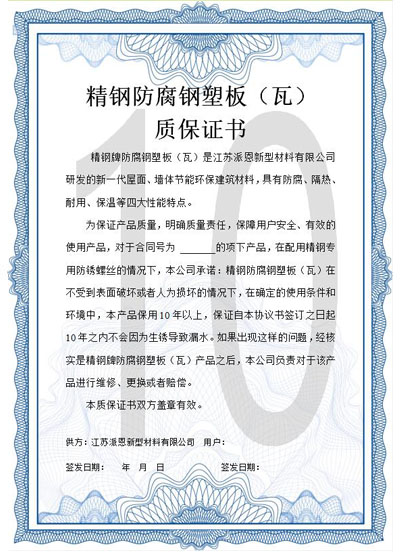 香蕉视频APP入口防腐鋼塑板擁有優異性能以及穩定品質,敢於在行業內提出在各種嚴酷環境下保用10年以上,包括腐蝕性環境廠房,並且出具廠家質保證書。針對這一點,有些客戶有疑問。說如果你們的產品真的能質保10年以上,那麽你們的價格一點也不貴,而是太便宜了。但是你們怎麽保證呢,期間出了問題怎麽辦?在此本公司再次聲明: